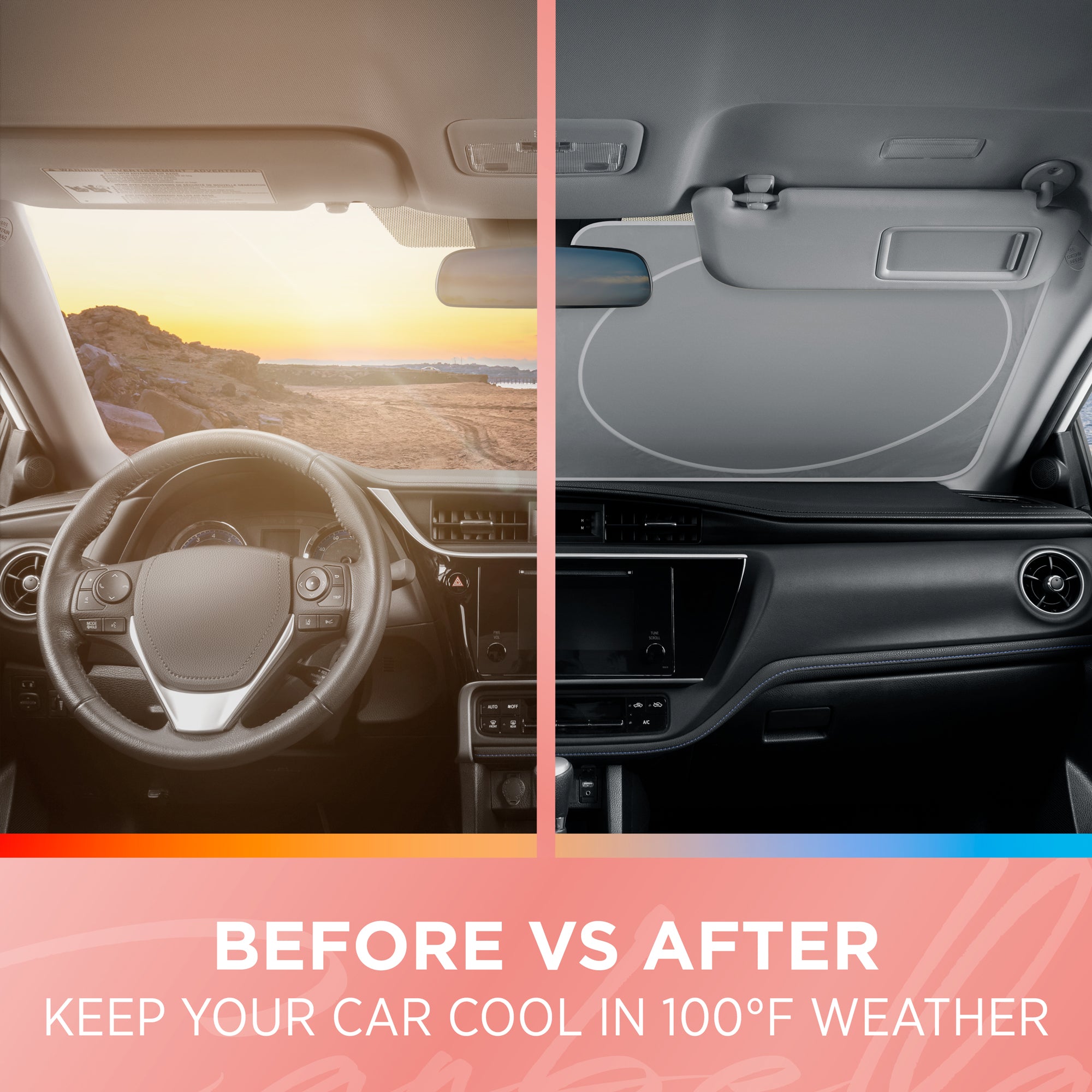 • Place auto shade in front of windshield between rear view mirror. Folds up with accordion design for easy storage. This efficient sunshade can keep your interior staying cooler by reducing temperature from 30 to 50 degrees.