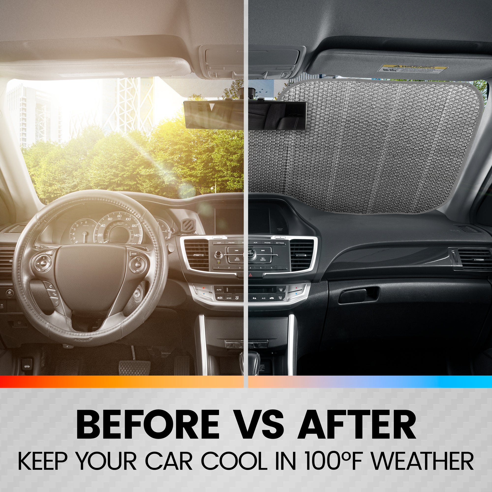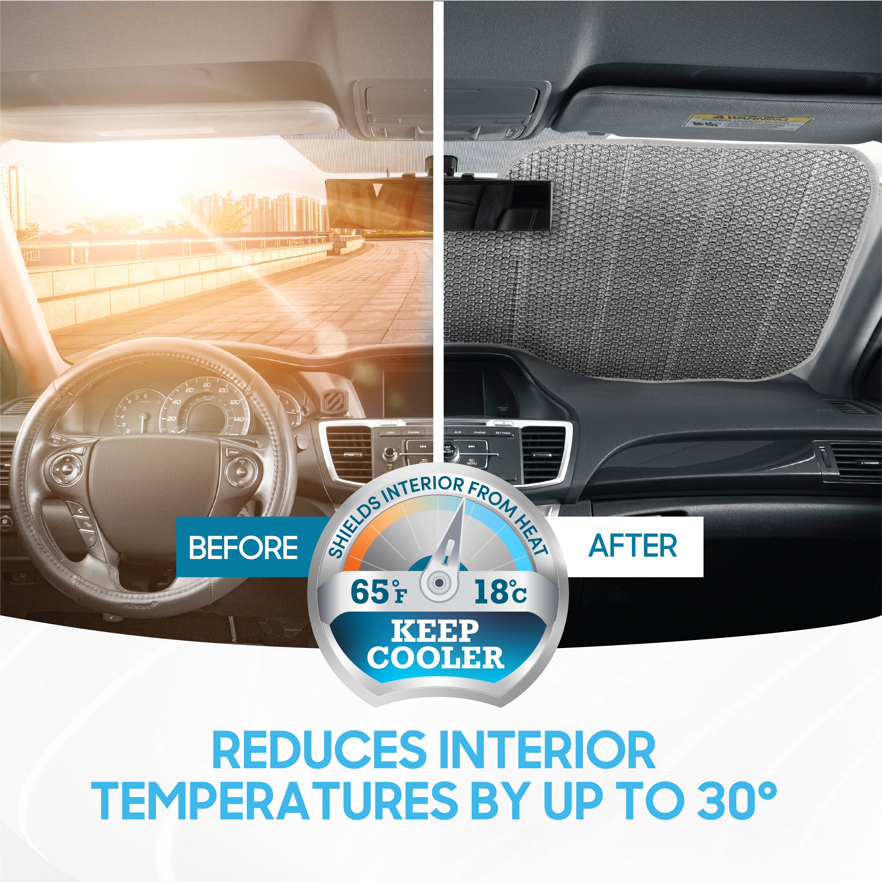- COMFORTABLE COOL INTERIOR - On a typical sunny day, avoid the extra heat and keep your interior cool with our top quality Windshield Sunshade Protector. Reduces interior car temperatures by 30-50 degrees which increases the lifespan of your vehicle's dash surface, radio, LCD Screen, GPS Devices and other electronics.