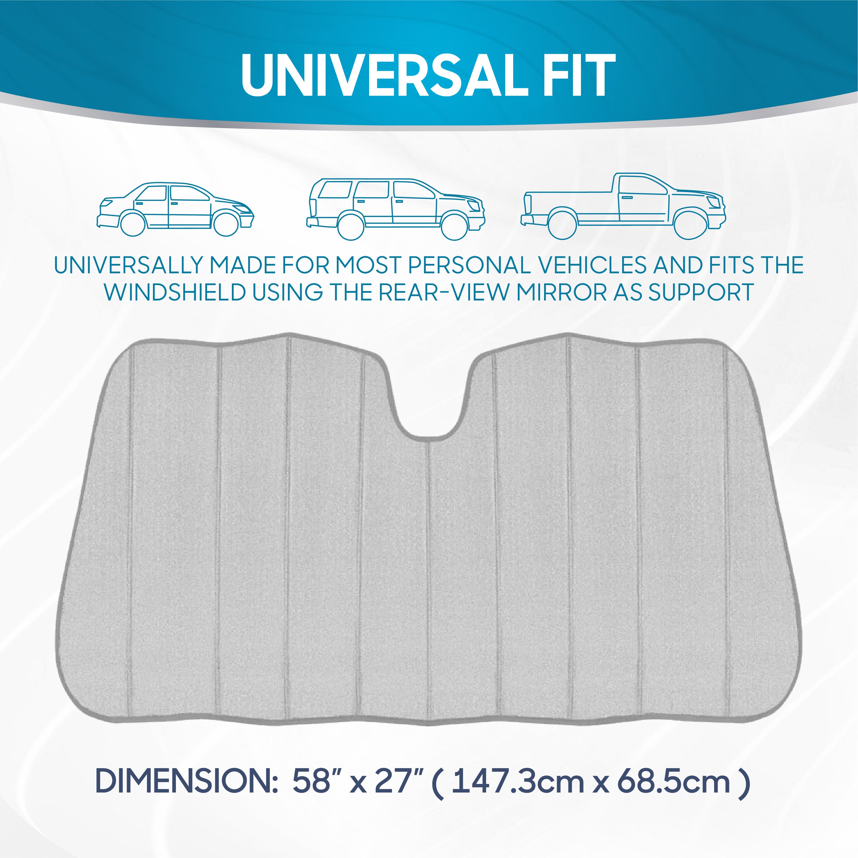 - TOP QUALITY FITMENT - Size: 57" Width x 27" Height. Universally made for most personal vehicles and fits the windshield using the rear-view mirror as support. The tapered edges allow for a more snug fit.