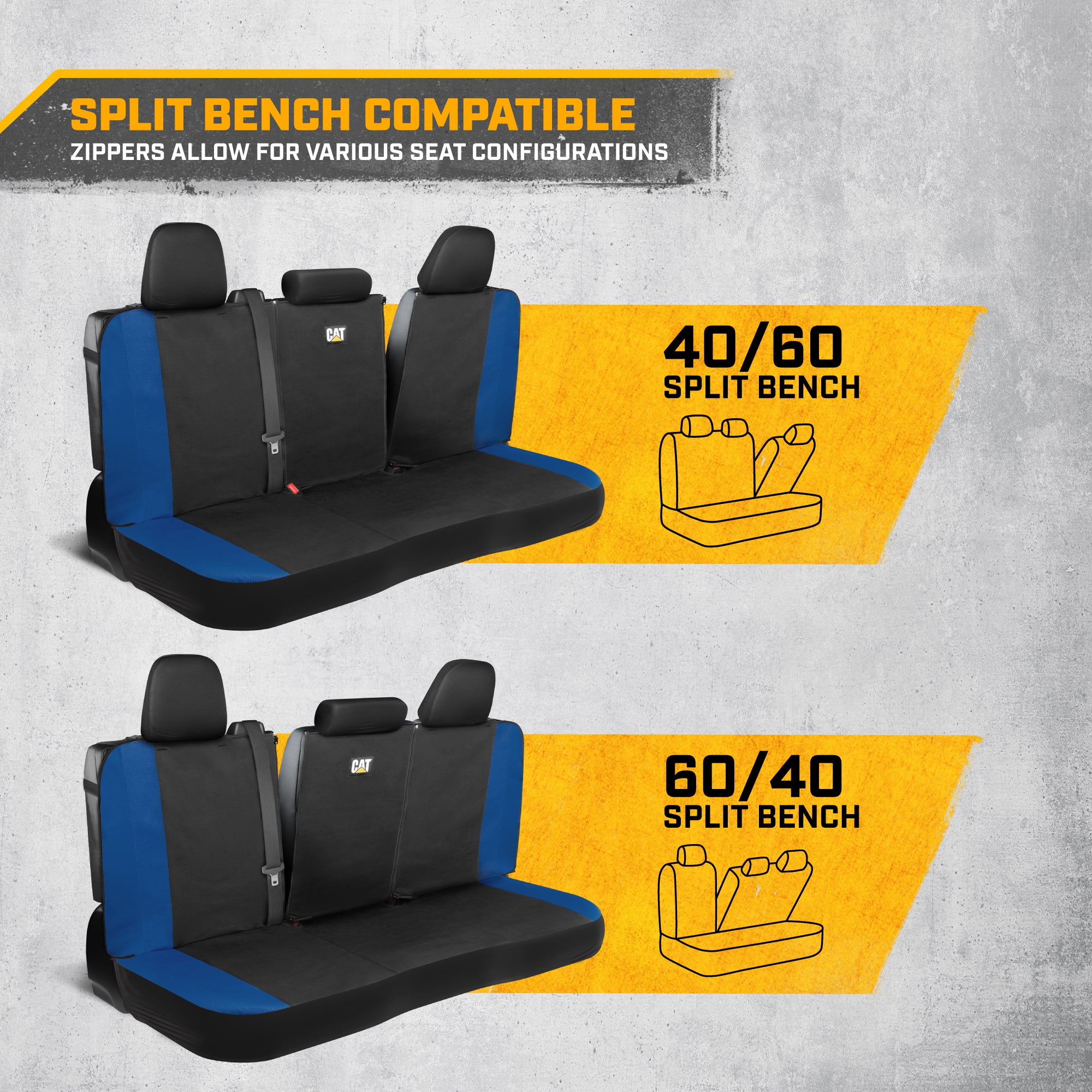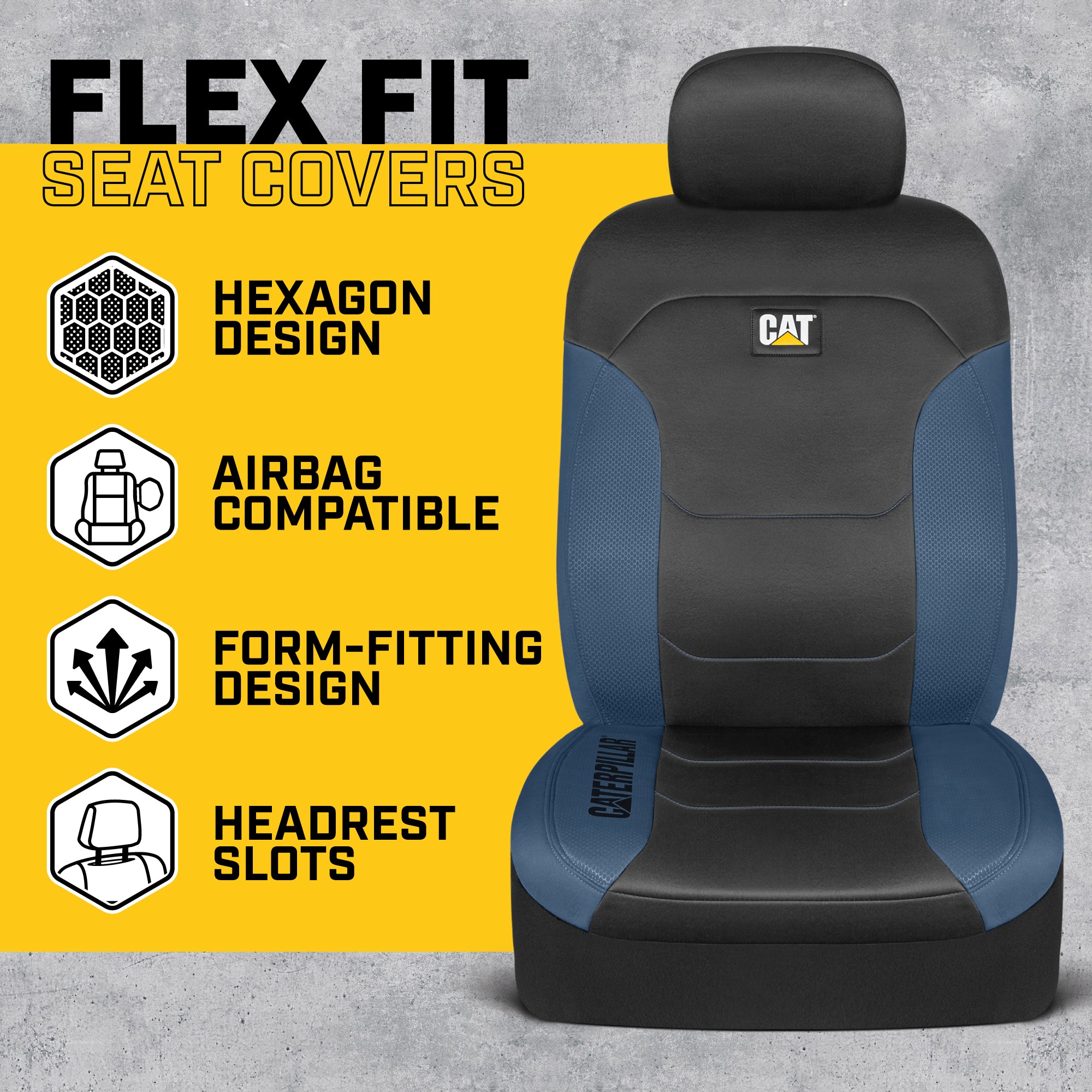 CAT® FlexFit 2-Tone Full Set Car Seat Covers – Front & Rear Seat Protection</b><br/>Upgrade and protect your vehicle’s interior with the CAT® FlexFit 2-Tone Full Set Seat Covers. Designed for universal fit, this complete set includes (2) front seat covers and a rear bench seat cover, providing full-coverage protection for cars, SUVs, trucks, vans, and minivans. Whether you’re refreshing your interior or protecting against daily wear, this set delivers comfort, durability, and style.</b><br/>The modern two-tone design with stitched accents enhances your vehicle’s look while maintaining a clean, factory-inspired appearance. Breathable FlexFit materials improve airflow for added comfort, making these covers ideal for daily driving, long commutes, and road trips.</b><br/>Engineered for a snug, customized fit, the front seat covers are airbag compatible, while the rear seat cover is designed to fit most standard and 60/40 split rear benches. Minor adjustments may be required to achieve the best fit depending on your vehicle model.</b><br/>Constructed from durable poly-cotton materials, these seat covers help protect against spills, stains, dirt, sweat, pet hair, and everyday wear and tear—keeping your original seats looking clean and new.</b><br/>Compatible with a wide range of vehicles including Ford (Explorer, Ranger, Escape, Expedition, Fusion, Mustang), Toyota (Tacoma, RAV4, Highlander, Camry, Corolla, Tundra), Chevrolet, Dodge, Honda (Civic, Accord, CR-V, Pilot, Odyssey), Nissan, Jeep, Tesla, Kia, Hyundai, Subaru, Audi, BMW, Mercedes-Benz, Lexus, and more.